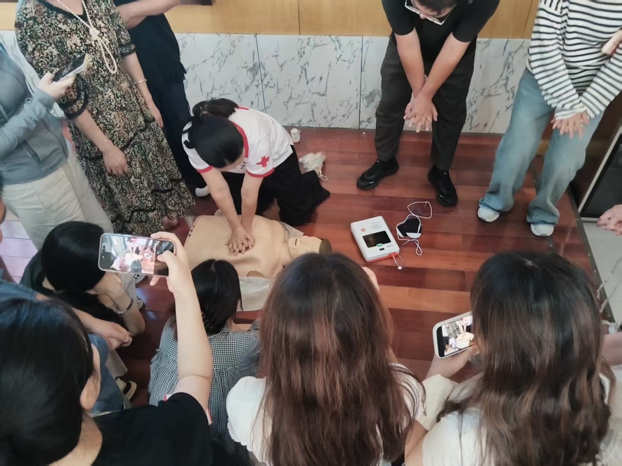 本次培训以“实战导向、学用结合”为原则,设置理论学习与实操训练两大环节。专业救护师围绕心肺复苏(CPR)、气道异物梗阻、常见意外伤害处理及自动体外除颤器(AED)操作等核心内容,通过案例分析、模拟演示、互动问答等形式,将急救知识转化为易学易用的技能。在实操环节,参训教职工在红十字会专业救护员的指导下,分组进行心肺复苏模拟演练,从按压位置、频率到AED设备使用,逐一规范操作流程,确保人人掌握急救要领。