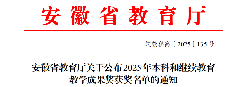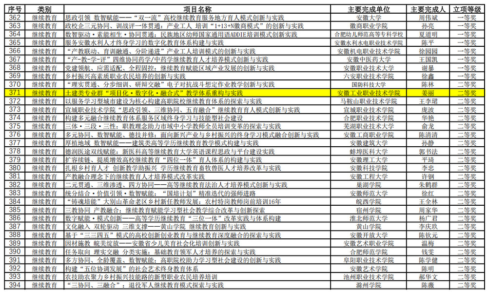 近日,安徽省教育厅正式公布了2025年本科和继续教育教学成果奖获奖名单。学院姜丽老师团队申报的《土建类专业群“项目化·数字化·融合式”教学体系重构与实践》项目荣获2025年继续教育省级教学成果奖二等奖。