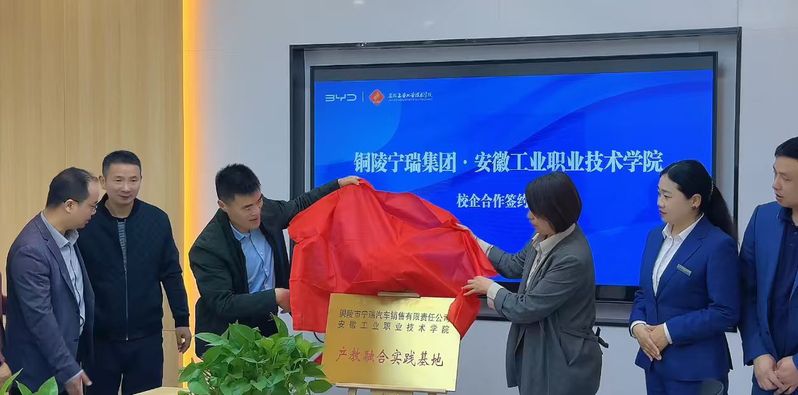 4月16日上午,学院党委书记范清义率教务处、机电学院相关负责人一行,赴铜陵市宁瑞汽车销售有限责任公司开展校企合作交流,双方正式签署校企合作框架协议,并共同为“产教融合实践基地”揭牌。