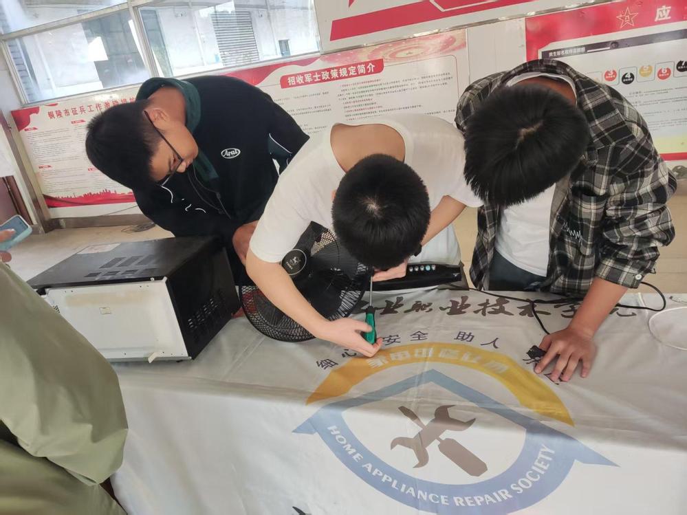 公益维修活动学生、教职工、周围居民陆续送来故障电器,有电风扇、电水壶、电蚊拍、微波炉等,社团成员耐心询问故障情况,仔细检测排查问题,活动持续了两个多小时,最终圆满结束。