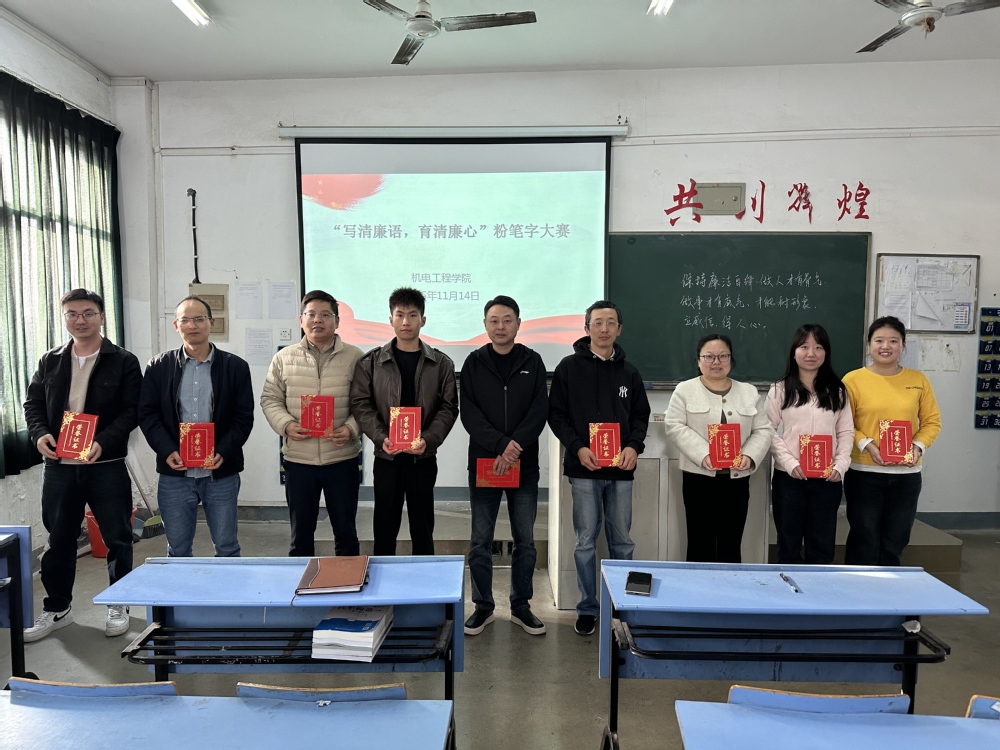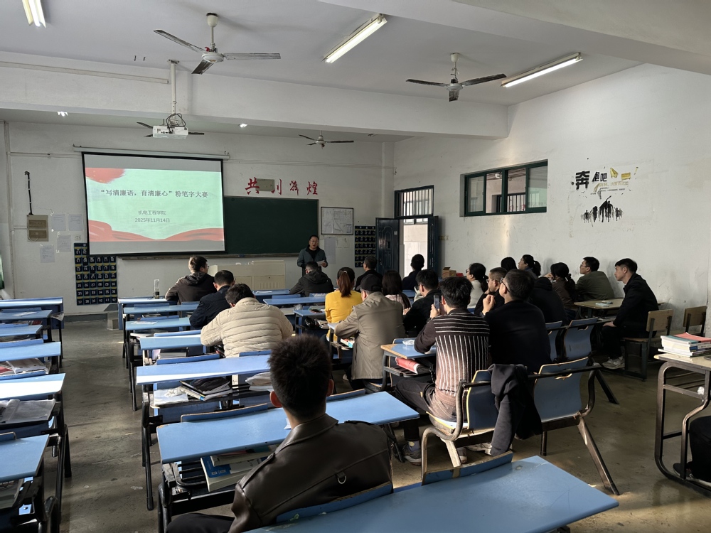 2025年11月14日下午,机电工程学院举办了一场别开生面的“写清廉语,育清廉心”教师粉笔字大赛。机电工程学院全体教师齐聚一堂,以粉笔为媒,书写清廉箴言,展现师者风采。