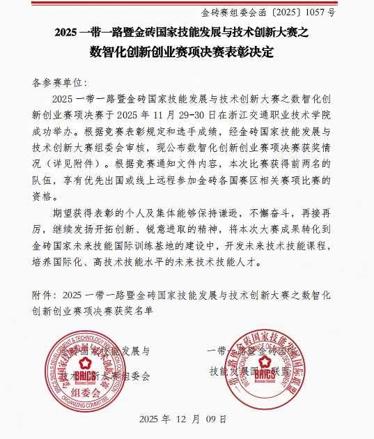 我院学子在2025一带一路暨金砖国家技能发展与技术创新大赛数智化创新创业赛项全国总决赛中荣获三等奖!