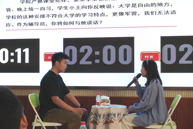 本次决赛设置案例研讨和谈心谈话两个环节。“案例研讨”环节以“我提问,你回答”的方式开展,入围决赛的十位辅导员通过抽签两两分组,围绕案例共同辨析原因、研讨对策、总结规律,快速寻找案例中问题的本质并提出解决方案,快速化解一个又一个“难题”。
