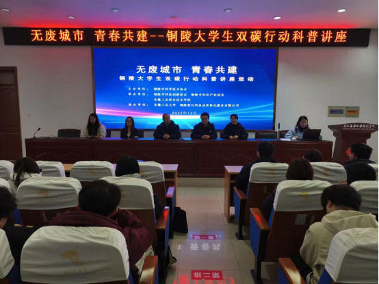 为深入贯彻落实国家“碳达峰、碳中和”战略部署,推动“无废城市”建设理念在青年群体中落地生根,2025年12月24日,由铜陵市科学技术协会牵头主办,铜陵市科技创新协会、铜陵市知识产权协会、学院联合承办,安徽工业大学、铜陵智引科技成果转化服务有限公司协办的“无废城市 青春共建——铜陵大学生双碳行动科普讲座”,在学院201报告厅成功举办。本次活动聚焦青年视角下的双碳实践,吸引了该学院多个专业的师生代表到场参与。
