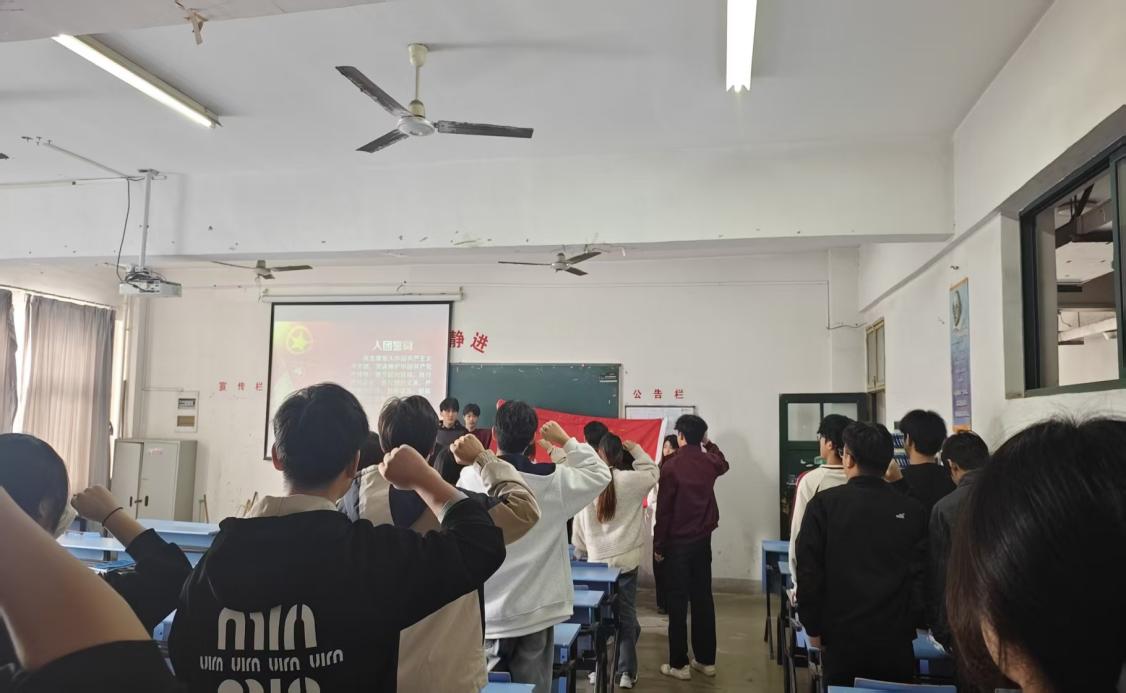 活动在庄严的《中华人民共和国国歌》声中拉开帷幕,全体人员起立行注目礼,现场气氛庄重肃穆。随后,团总支书记朱老师宣读了《关于批准刘军毅等21名同学为中国共产主义青年团团员的决定》。新团员们满怀激动的心情依次上前,由老团员代表为他们佩戴闪耀的团徽。团徽在胸前熠熠生辉,它不仅是一份荣誉,更意味着一份沉甸甸的责任,象征着他们正式成为共青团这个光荣组织的一员。